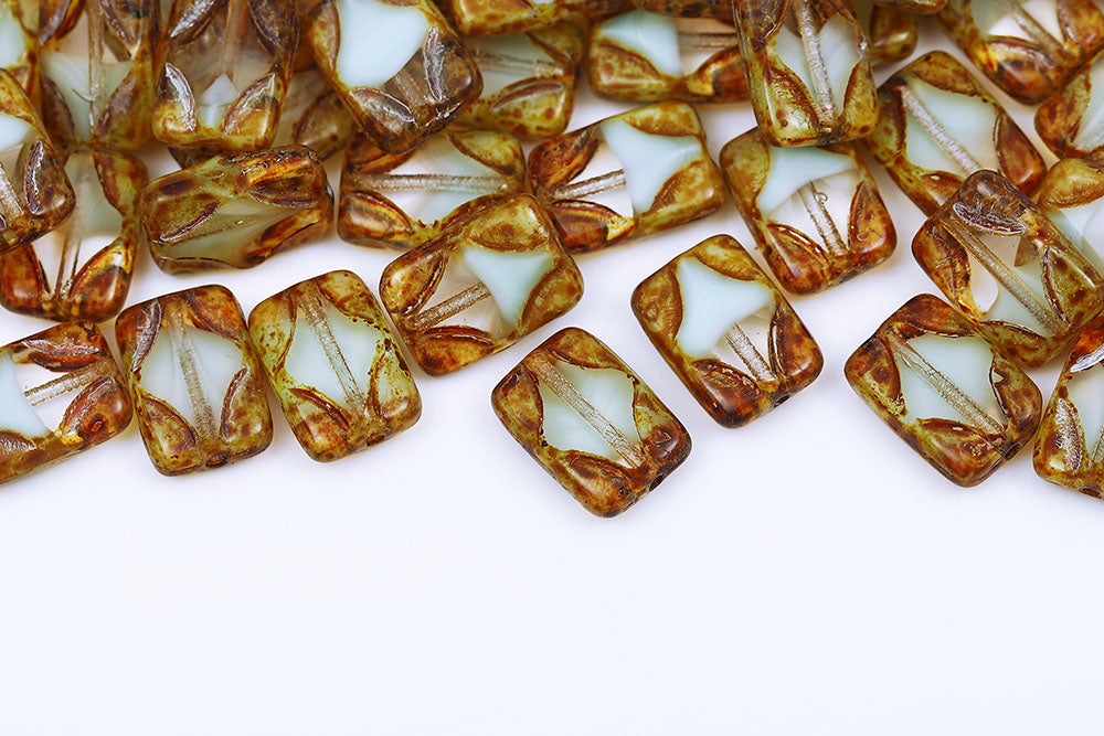Window Rectangle 12×8mm White Green Mixed Travertine 1-Hole Czech Beads