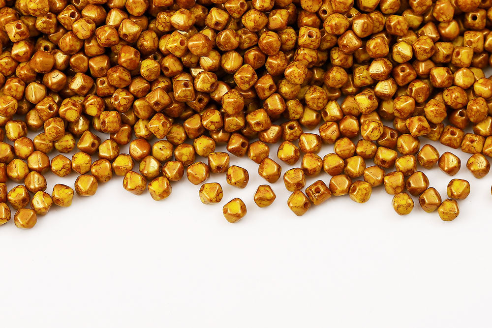 Bicone 4×4mm Lemon With Gold Marble Finish 1-hole Czech Beads