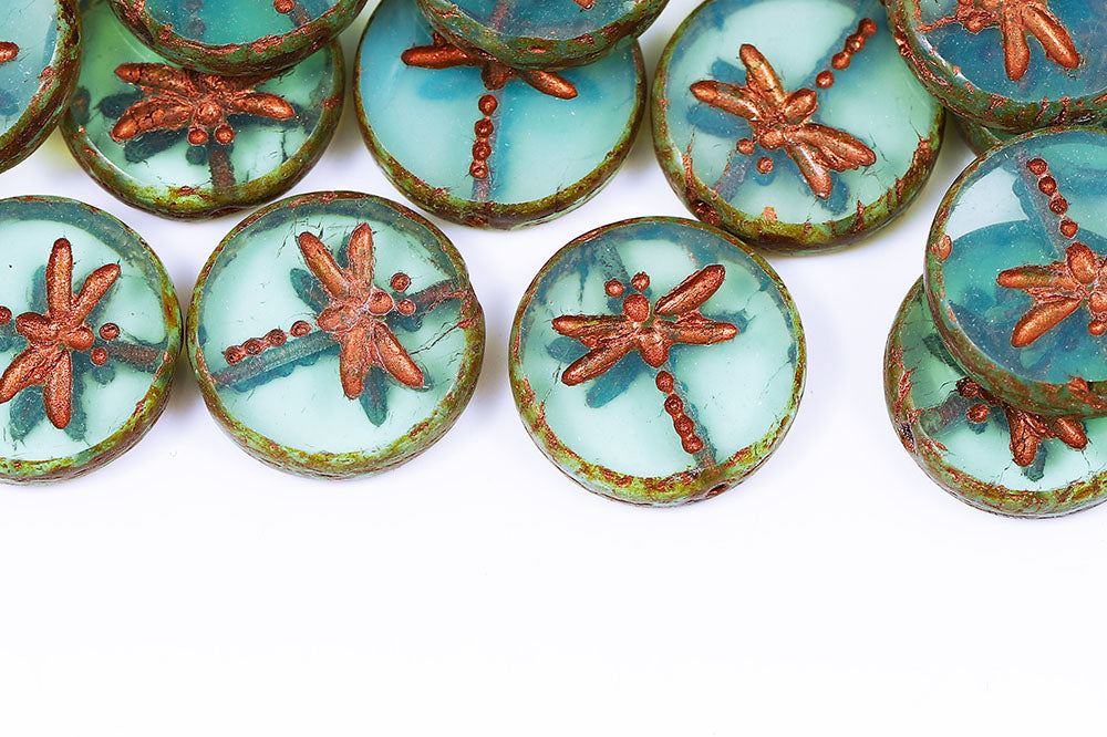 Dragonfly Coin 17mm Opal Aqua Travertin With Copper 1-Hole Czech Beads