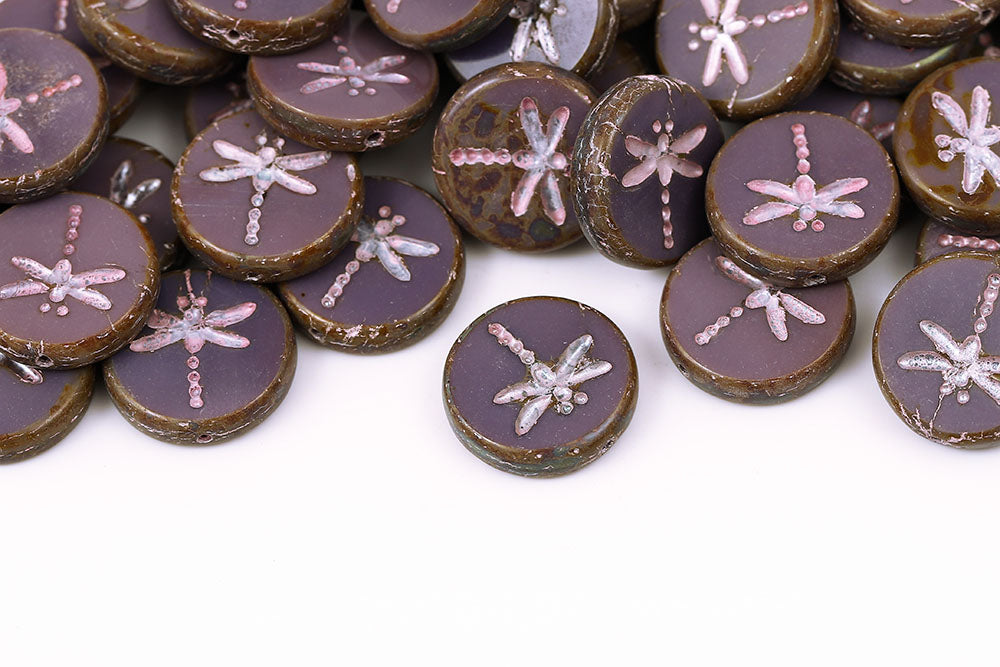 Dragonfly Coin 17mm Crystal Travertin With Purple 1-Hole Czech Beads