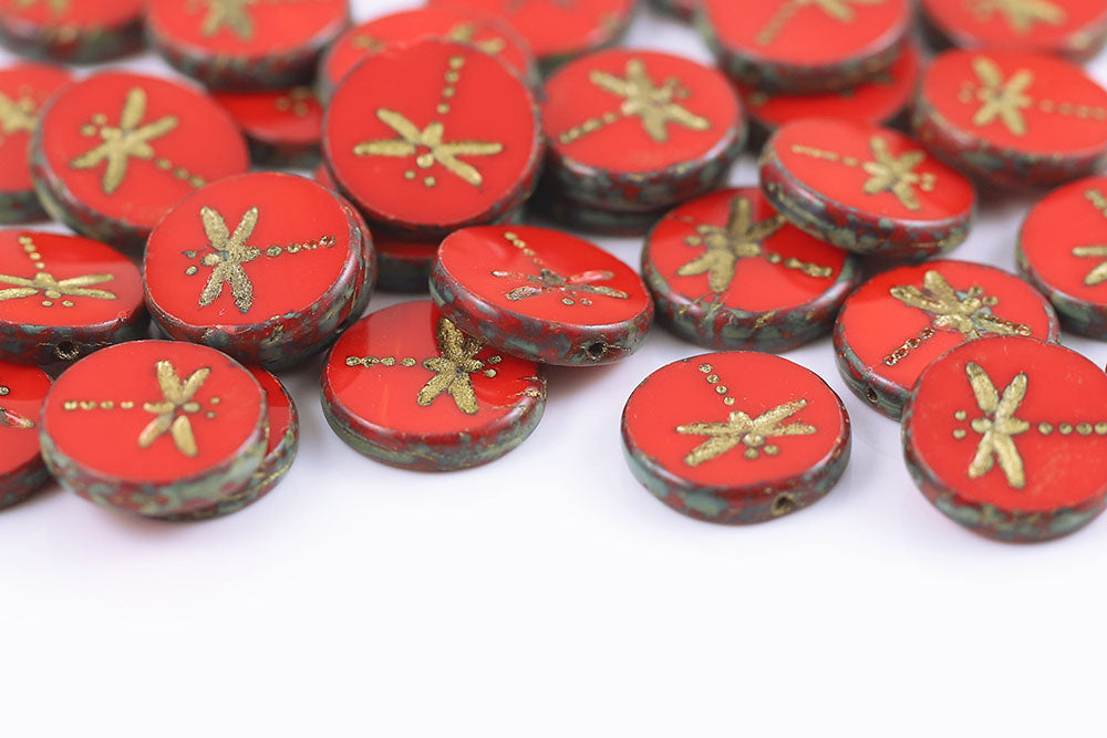 Dragonfly Coin 17mm Opaque Red Travertin With Gold 1-Hole Czech Beads