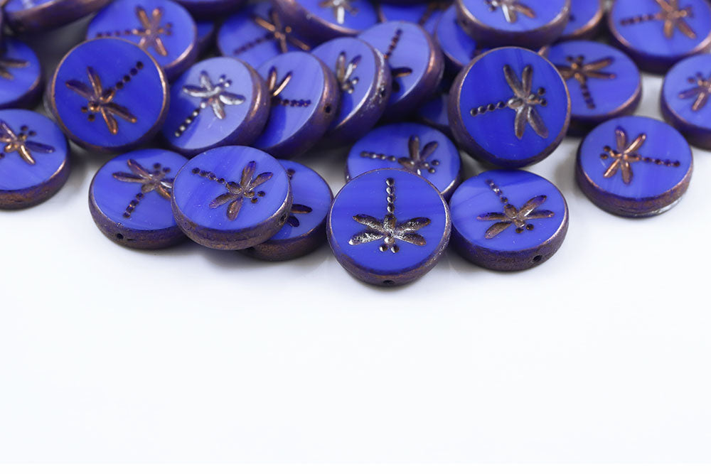 Dragonfly Coin 17mm Opaque Blue Violet Luster 1-Hole Czech Beads