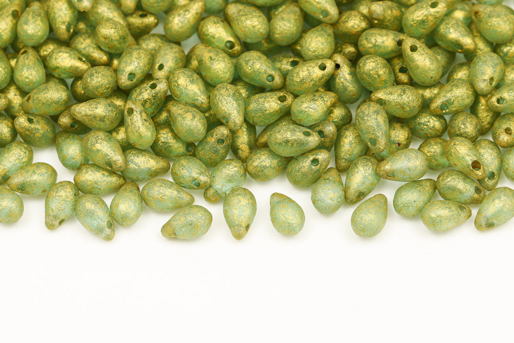 Drops 6×9mm Gold Splash Aqua Etched Finish Czech Beads