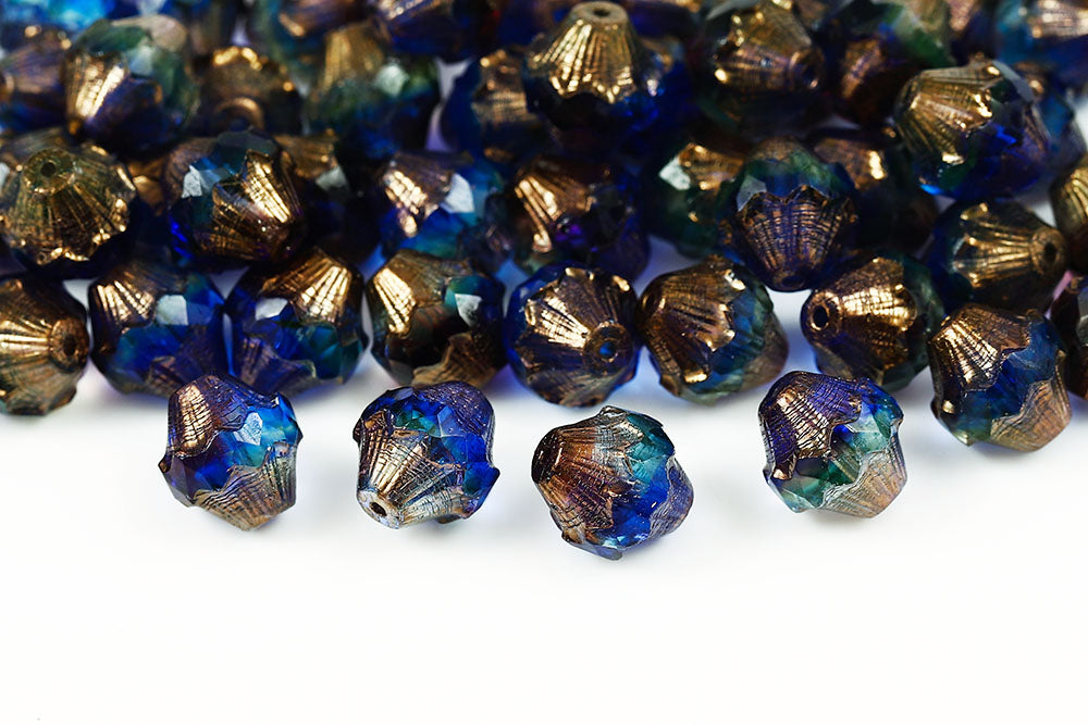 Firepolished Bicones 11×10mm Blue Green Mixed Violet Luster Czech Beads