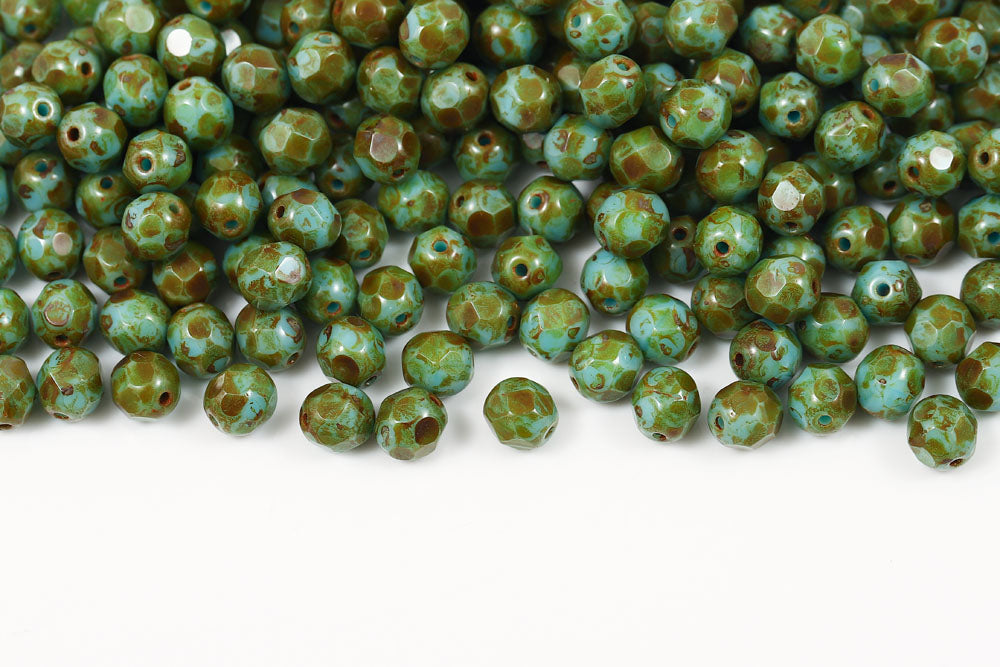 Czech Fire Polished 6mm Turquoise Green Travertin Round Beads