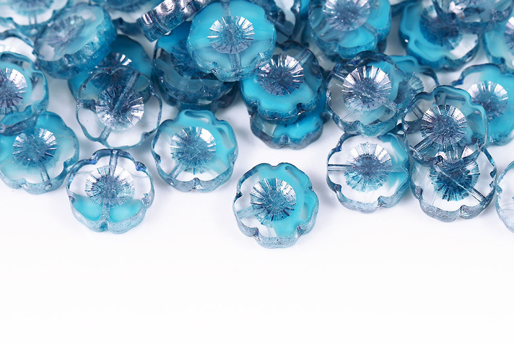 Hawaiian Flowers 14mm Crystal Aqua Mixed Blue Luster 1-Hole Czech Beads