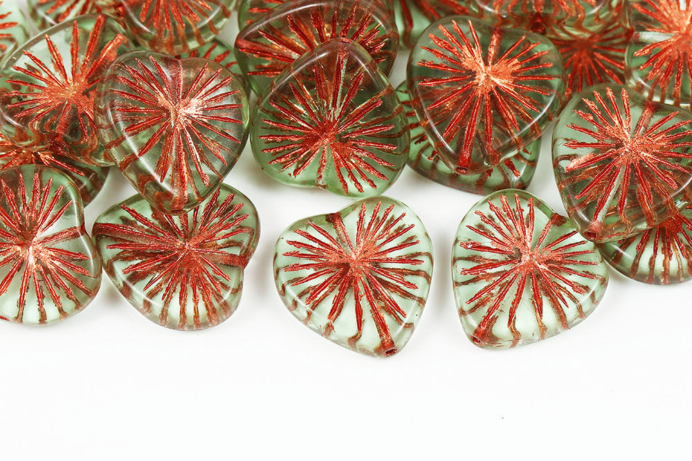 Heart 18mm Grass Green With Copper Czech Glass Beads - Galaxy beads