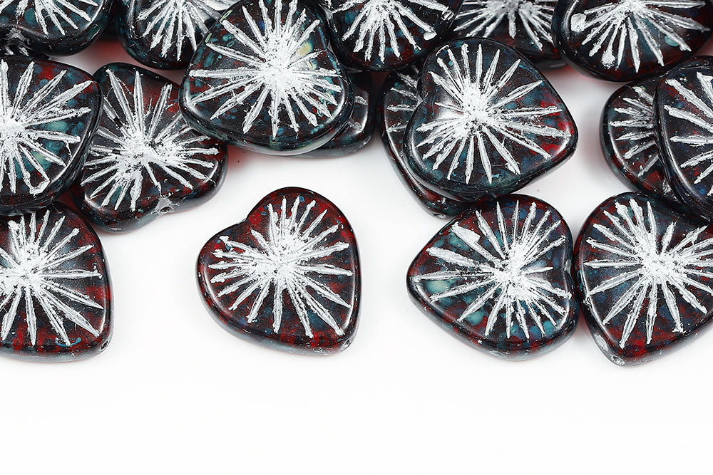 Heart 10mm Silver Splash Siam Czech Glass Beads