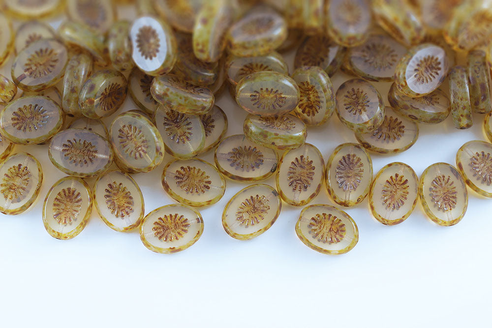 Kiwi 14×10mm Amber Streaks Travertin 1-Hole Czech Beads