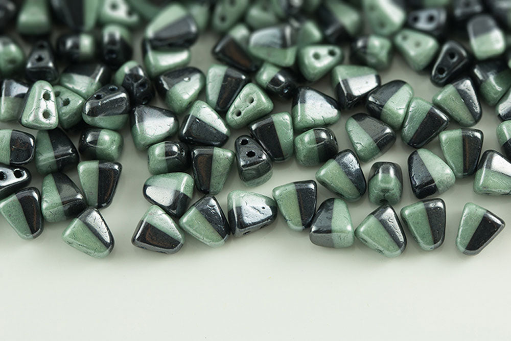 Nib-Bit 6×5mm Black/white Opaque Green Luster 2-Hole Czech Beads
