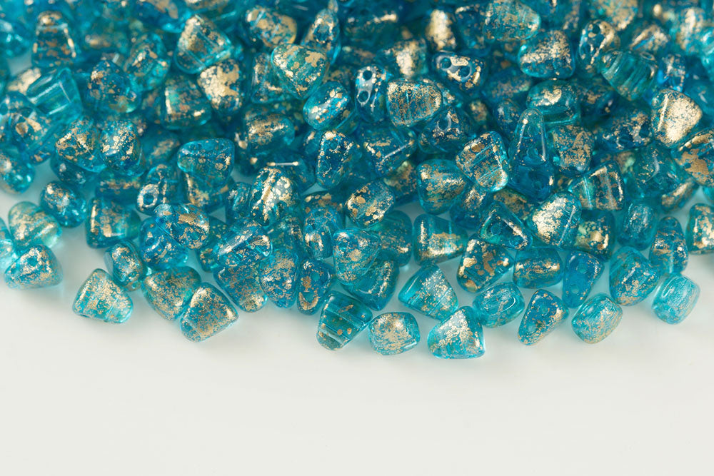 Nib-Bit 6×5mm Gold Splash Aquamarine 2-Hole Czech Beads