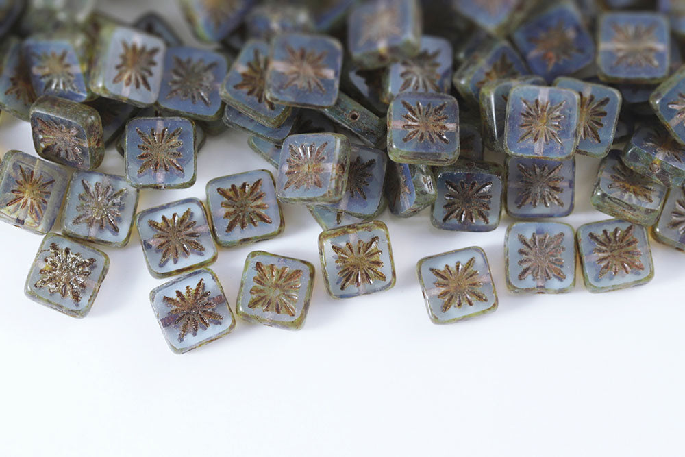 Squared Kiwi 10×10mm Crystal Travertin Blue Finish 1-Hole Czech Beads