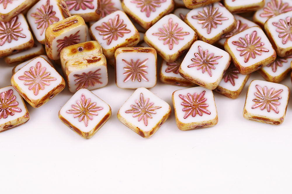 Squared Kiwi 10×10mm Chalk With Pink 1-Hole Czech Beads