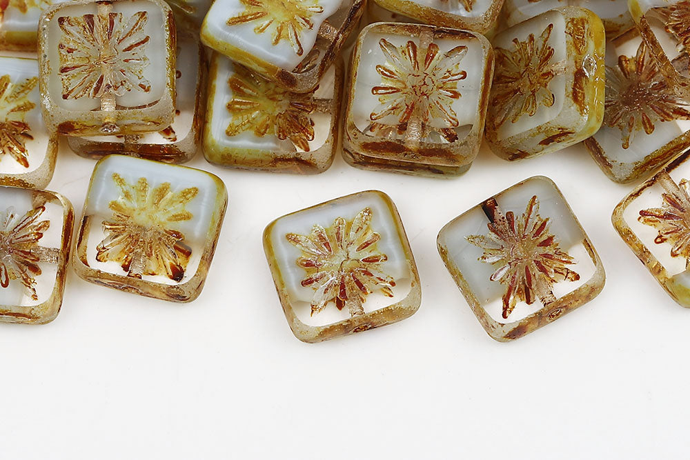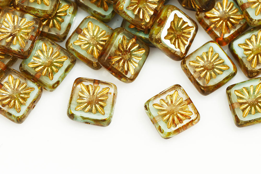 Squared Kiwi 10×10mm Crystal Travertin With Gold 1-Hole Czech Beads