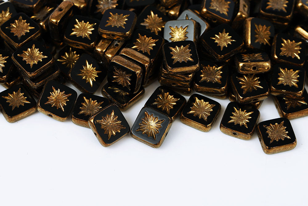 Squared Kiwi 10×10mm Jet Travertin With Gold 1-Hole Czech Beads