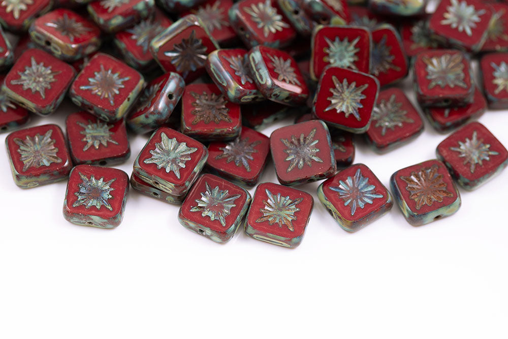 Squared Kiwi 10×10mm Dark Red Travertin 1-Hole Czech Beads