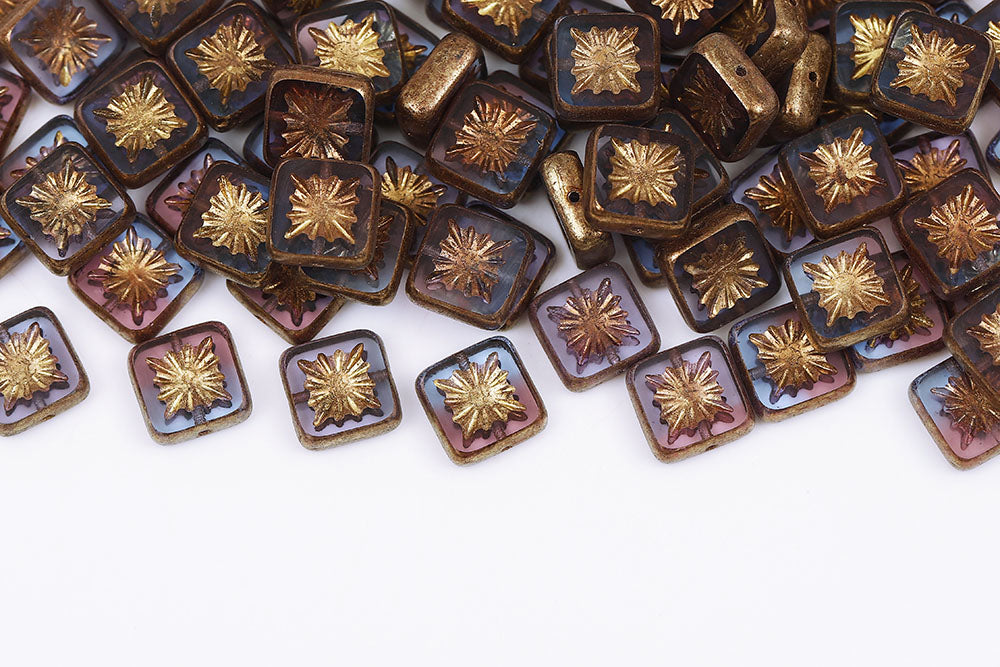 Squared Kiwi 10×10mm Lt.Amethyst Sapphire Mixed Gold Finish 1-Hole Czech Beads