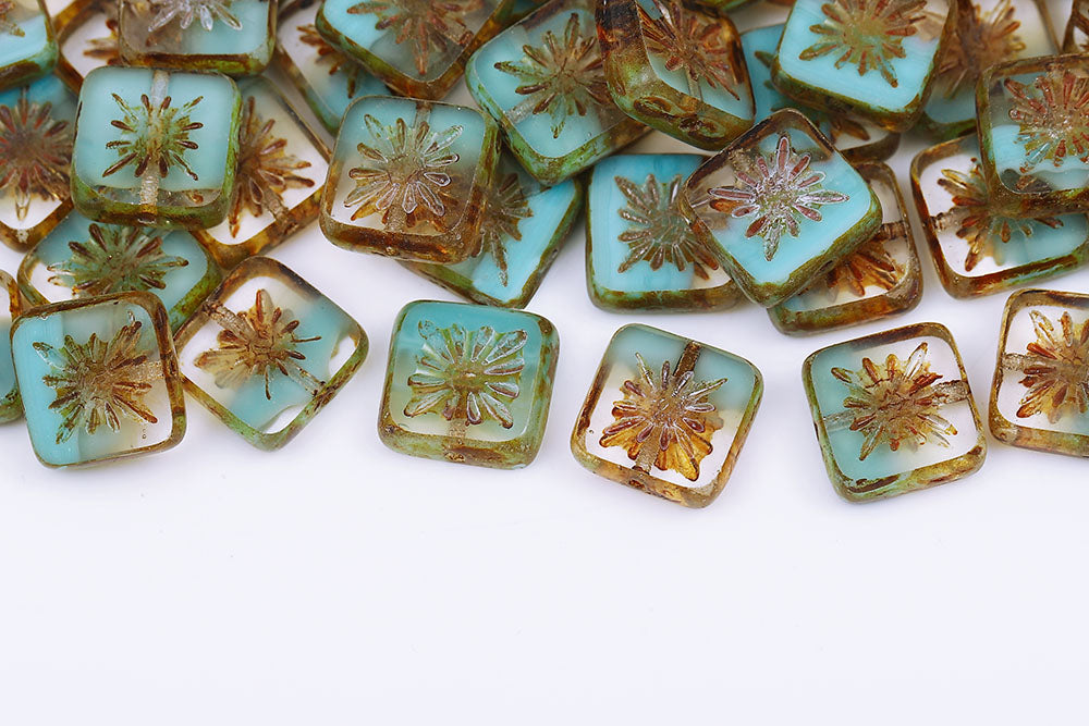 Squared Kiwi 10×10mm Aqua With White Matt 1-Hole Czech Beads