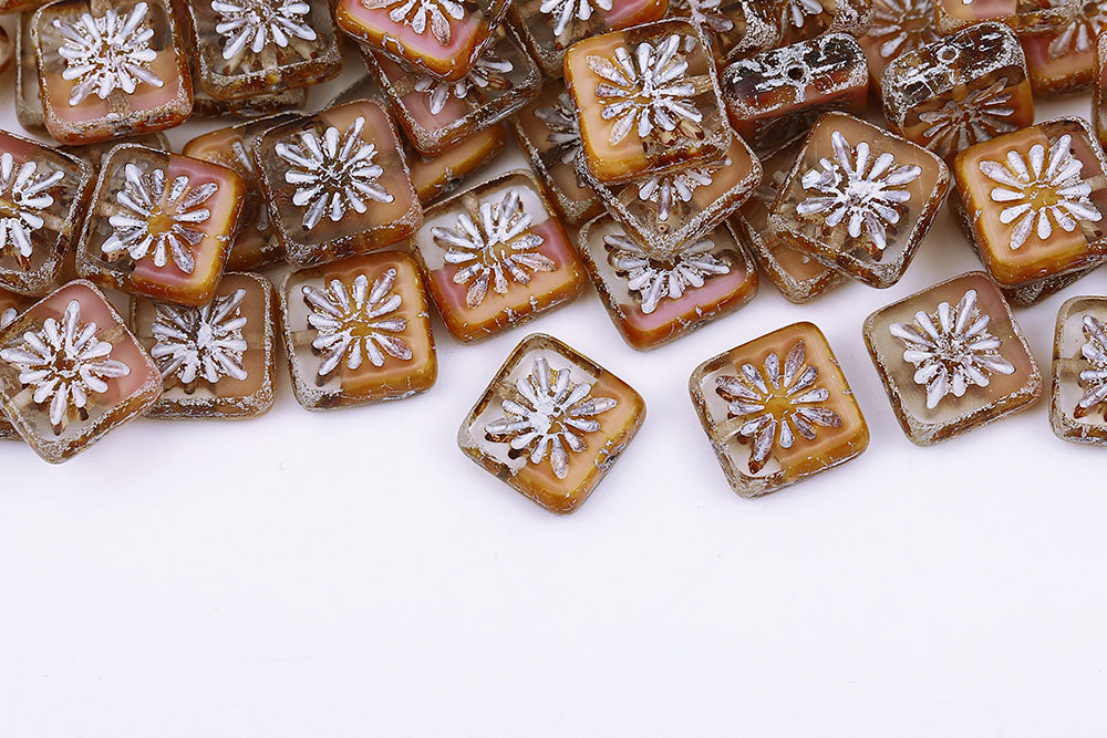 Squared Kiwi 10×10mm Crystal Travertin With Pink 1-Hole Czech Beads