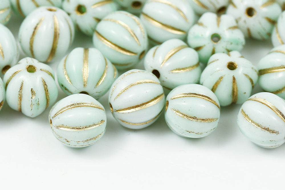 Melon 8mm Opaque White Green Mixed With Gold Czech Beads