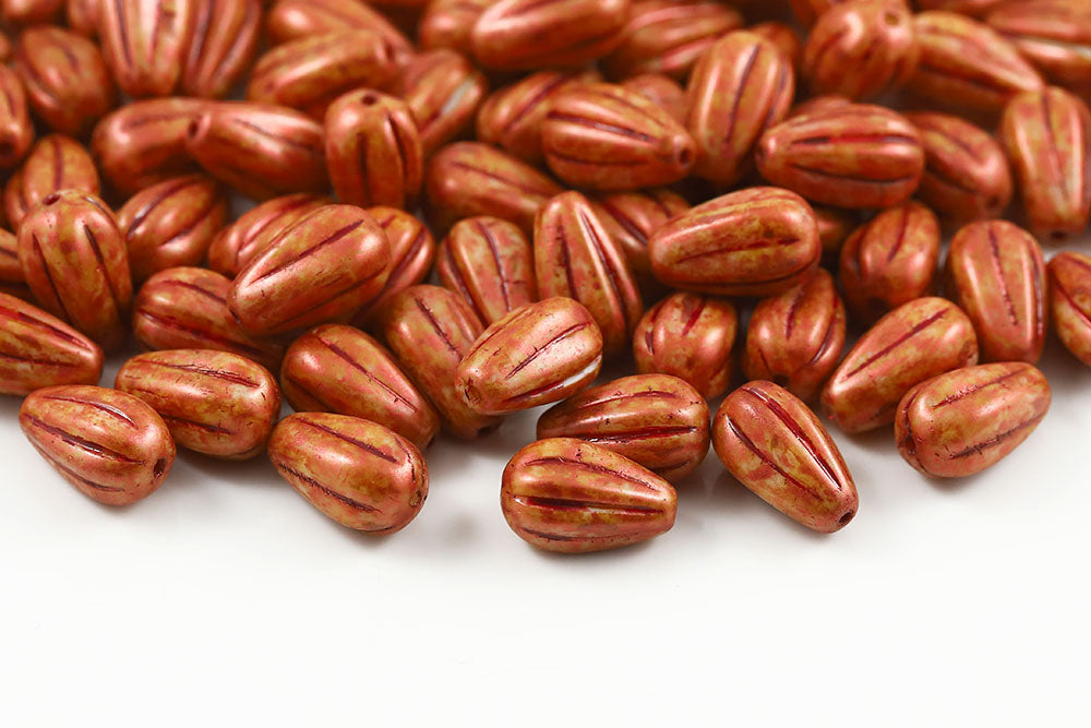 Melon Drops 13×8mm Chalk Orange Marble Finish With Red Czech Beads